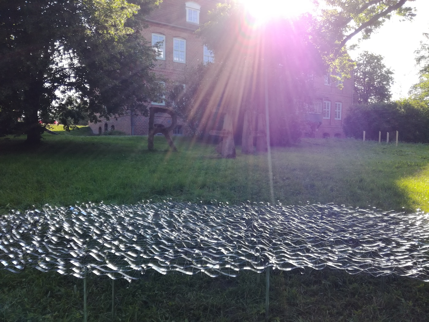 The artistic installation shows a rippled and reflecting wave surface that appears to float like a mirage above the green area between Plüschow Castle and the former lake.