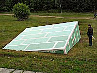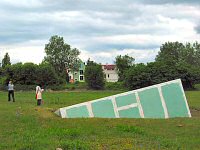 InterimFeuchtraum-Gipskartonplatten auf Lattengerüst,Kantenlänge 6 m - Kostrzyn, Polen 2004 Temporäre Bodenskulptur auf dem ehemaligen Gelände der zerstörten Festung Küstrin (Marktplatz) im Rahmen des Projekts "Dialog Loci - Bastion der Kunst" Auf dem Gelände des ehemaligen Marktplatzes ragt die grün schimmernde Schrägskulptur aus dem Boden. Sie besteht aus sorgsam verarbeiteten Rigisplatten, die einen temporären, provisorischen Eindruck machen und Teil einer Würfelform sind, vorstellbar als Ecke eines großen Baukörpers. Der größte Teil bleibt unterirdisch im imaginären Raum verborgen. Der Körper neigt sich, er scheint im Prozess begriffen, zu versinken oder aus der Erde emporzuwachsen. Das lässt sich nicht klären. |