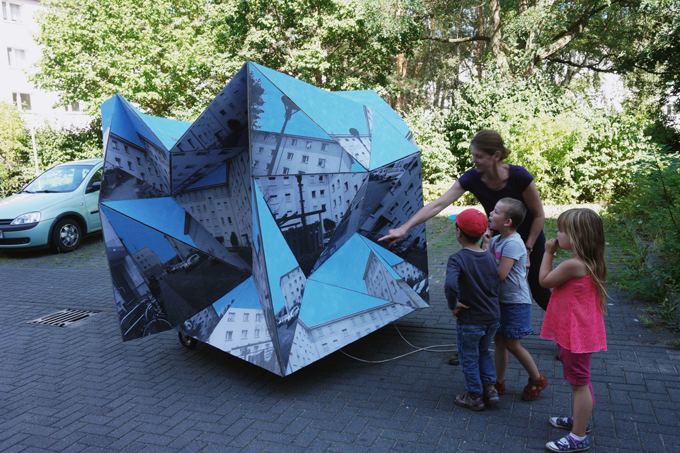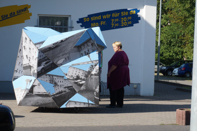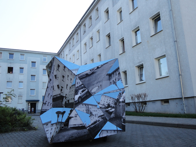 Its original shape has been generated from a cube. The numerous panels of the crystalline sculpture are covered with photos of a stereotype DDR-housing complex from the seventies, some of them painted with skyblue color. Apparently they are creating the illusion of a reflexion.