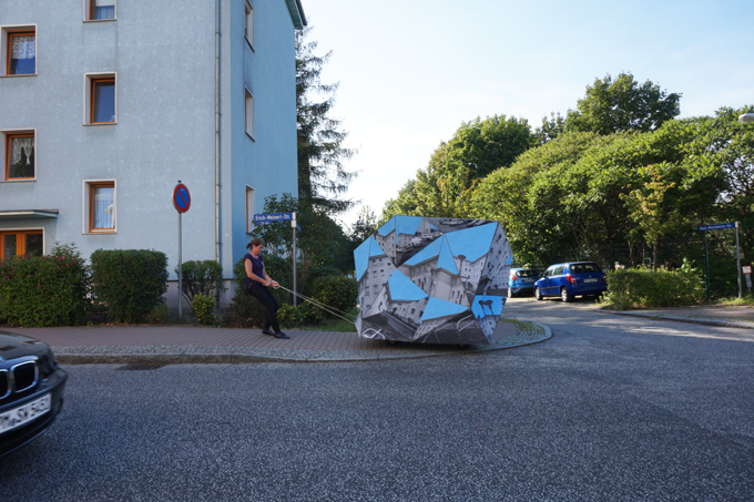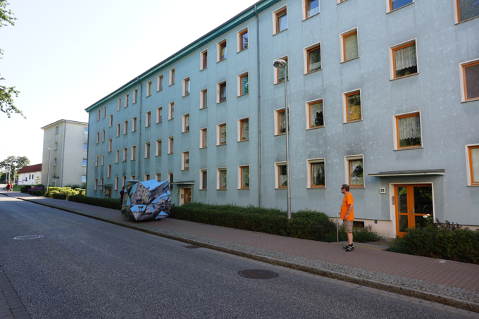 The housing complex "Klinkengrund" where the photos were taken is located in the nearby district town of Bad Belzig. During 2 days in the summer of 2015 the Irrläufer is being pulled around the blocks of this neighbourhood.