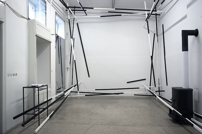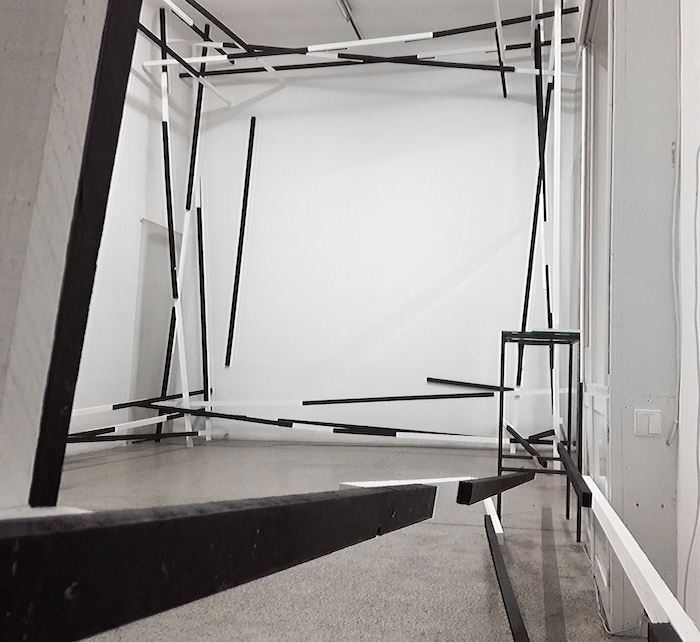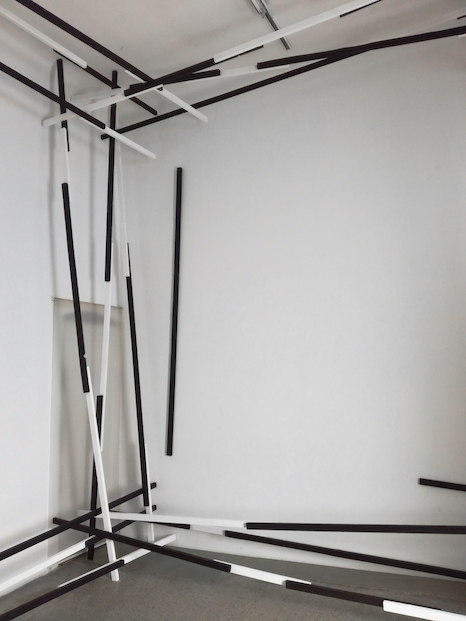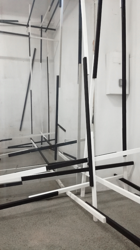 Der Raum bleibt zwischen Statik und Dynamik stecken. Beunruhigend ist die enge Beziehung zwischen Installation und tatsächlichem Raum. Hält die Konstruktion (noch) den Raum oder bebt (schon) die Umgebung?