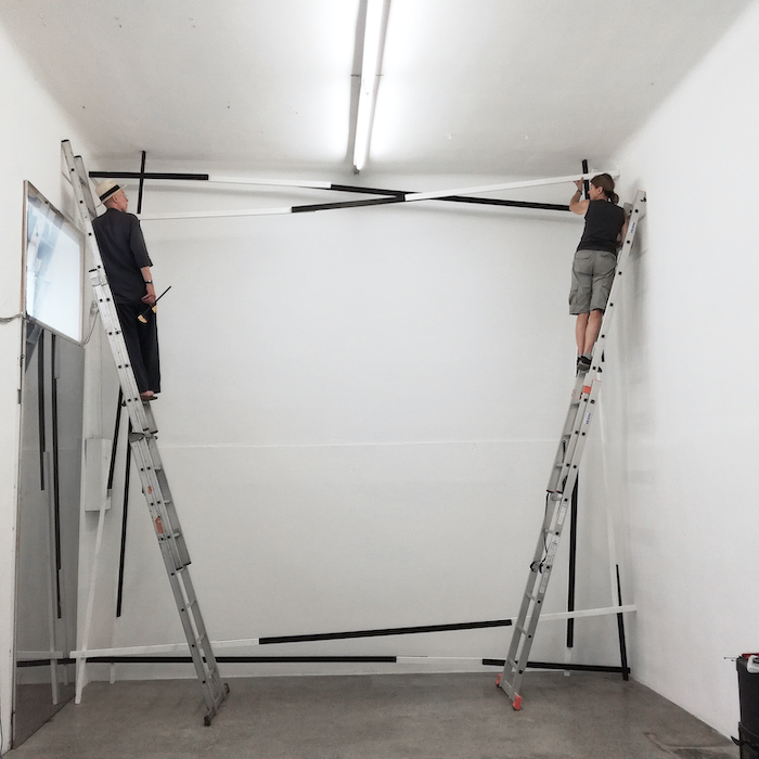 Material: 300m Dachlatten, schwarze und weiße FarbeObjektmaße: 9m x 4,70m x 4,70m